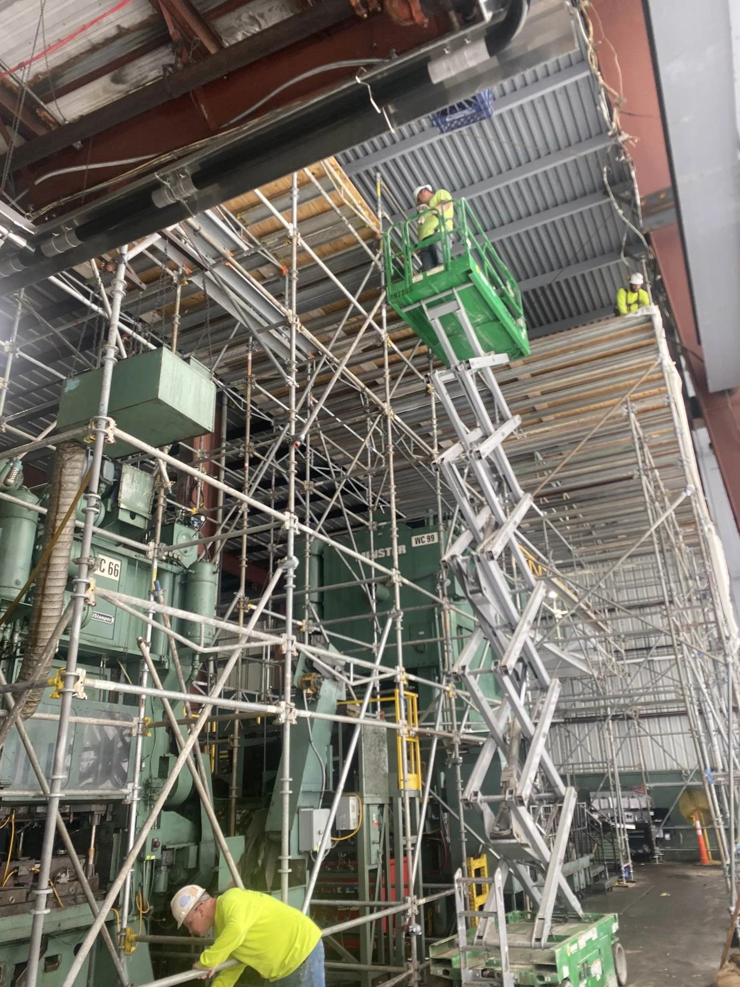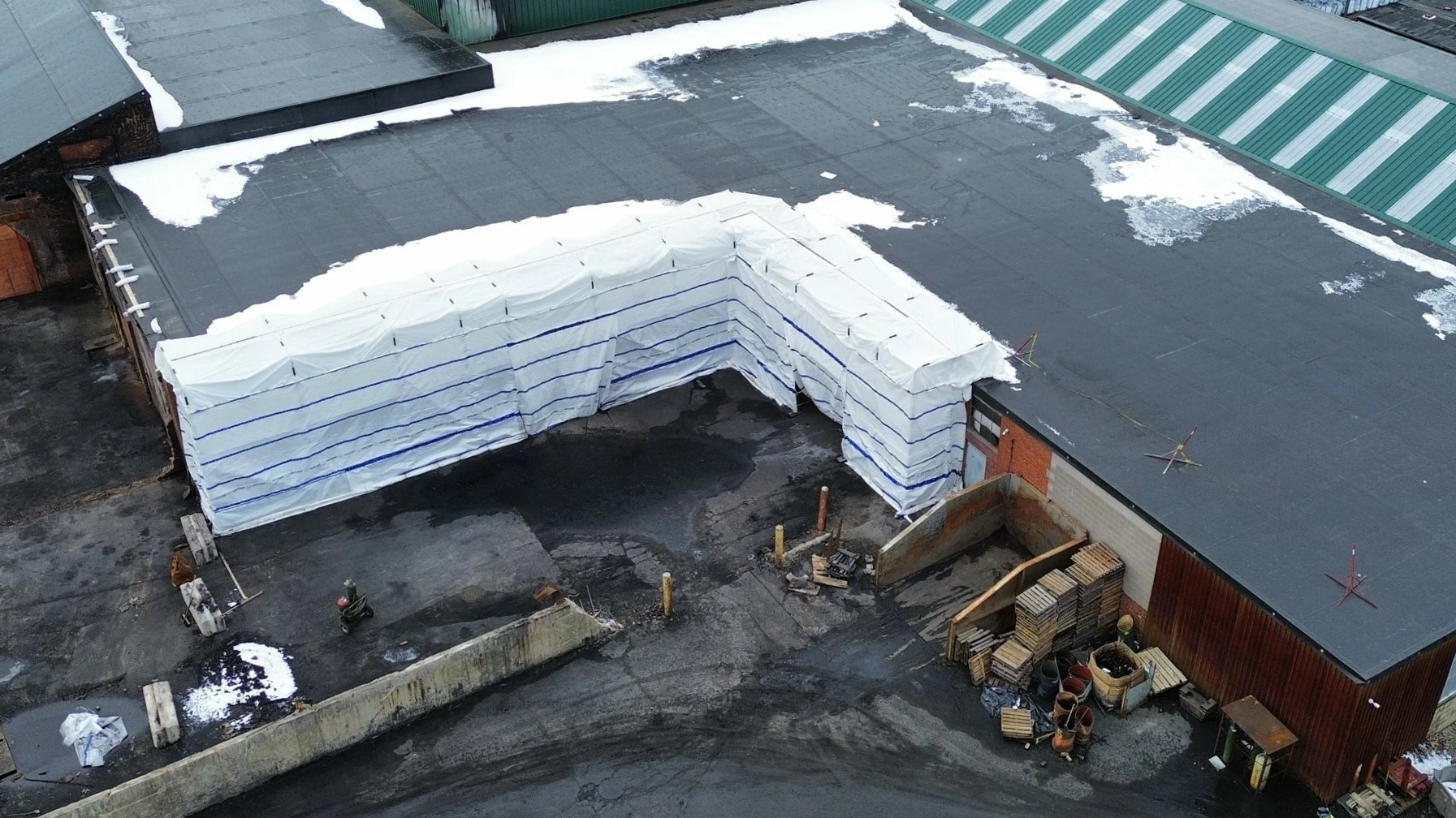 Temporary scaffolding and exterior sealing were installed to protect the structure and maintain a controlled environment inside the facility—allowing operations to continue safely while restoration work progressed.